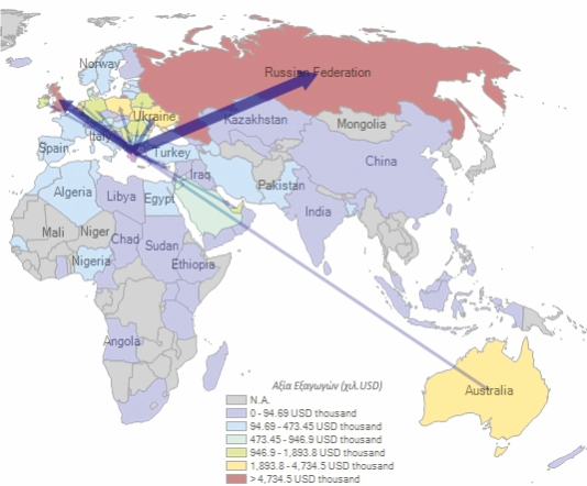 Κύριοι εξαγωγικοί εταίροι της χώρας μας είναι η Ρωσία, το Ηνωμένο Βασίλειο, η Ουκρανία, το Βέλγιο και η Αυστραλία, γεγονός που αντικατοπτρίζεται στον παραπάνω χάρτη.
