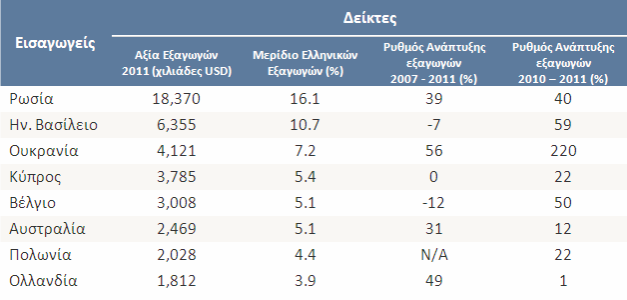 Στον πίνακα που ακολουθεί οι βασικοί εξαγωγικοί εταίροι της Ελλάδας κατατάσσονται με βάσει τρεις σημαντικούς δείκτες.