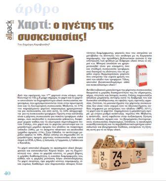 Στο άρθρο με τίτλο «Χαρτί: ο ηγέτης της συσκευασίας!», που δημοσιεύτηκε στο 64ο τεύχος του περιοδικού συσκευασίας Allpack, ο Κος Καραβασίλης αναλύει τη διάρθρωση της αγοράς της χάρτινης συσκευασίας καθώς και τις νέες τάσεις που επικρατούν σε αυτήν. Κεντρικός άξονας του άρθρου, είναι τα πλεονεκτήματα και μειονεκτήματα της χάρτινης συσκευασίας και η απήχησή της στο καταναλωτικό κοινό για λόγους υγιεινής και περιβαλλοντικής συνείδησης αλλά και λόγω της ευελιξίας του υλικού που μπορεί να προσφέρει χάρτινες συσκευασίες υψηλής αισθητικής .