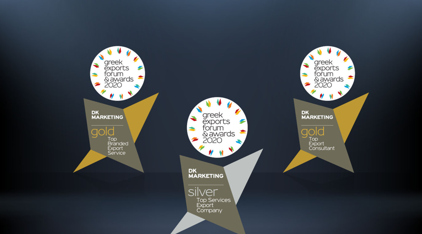 Η DK Marketing, ανάμεσα σε σημαντικές υποψηφιότητες, απέσπασε 3 βραβεία, 2 χρυσά στις κατηγορίες Top Export Consultant & Top Branded Export Service και 1 ασημένιο στην κατηγορία Top Services Export Company.